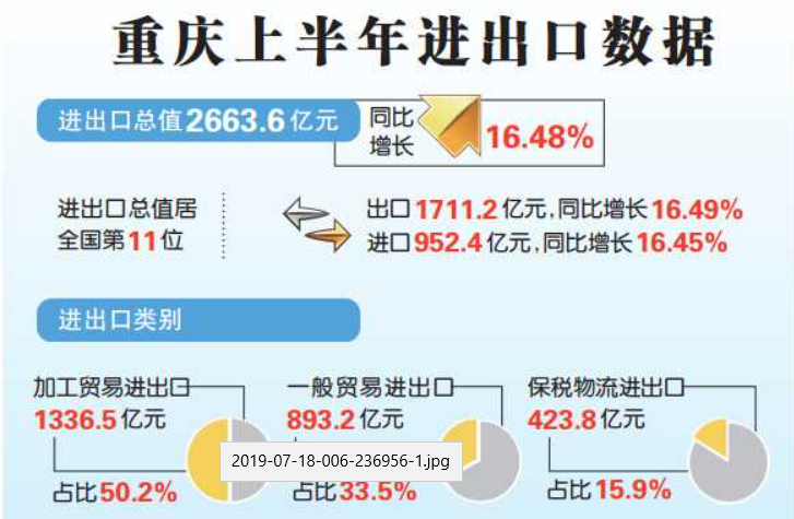 7月17日,重庆海关发布消息称,今年上半年,重庆进出口总值2663.6亿元,较去年同期(下同)增长16.48%,进出口总值居全国第11位。