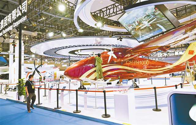 在中国航天科技集团有限公司展台,有一灰一红两架无人机,长度跟两辆车差不多。灰色的无人机有两个巨大的机翼,机翼末端有螺旋桨,是一款eVTOL(电动垂直起降飞行器);红色无人机名为彩虹-YH1000,是一款无人运输机。