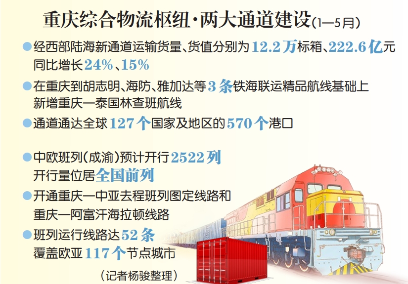 今年1—5月,重庆经西部陆海新通道运输货量、货值分别为12.2万标箱、222.6亿元,同比增长24%、15%,并在重庆到胡志明、海防、雅加达等3条铁海联运精品航线基础上,新增重庆—泰国林查班航线,通道通达全球127个国家及地区的570个港口。