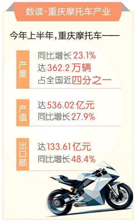 今年上半年,重庆摩托车产量同比增长23.1%,达到362.2万辆,占全国近四分之一;产值高达536.02亿元,同比增长27.9%。