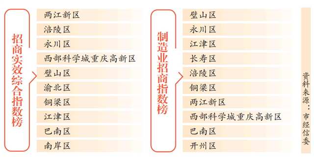制造业招商指数榜,前10位分别是:璧山区、永川区、江津区、长寿区、涪陵区、铜梁区、两江新区、西部科学城重庆高新区、巴南区、开州区。